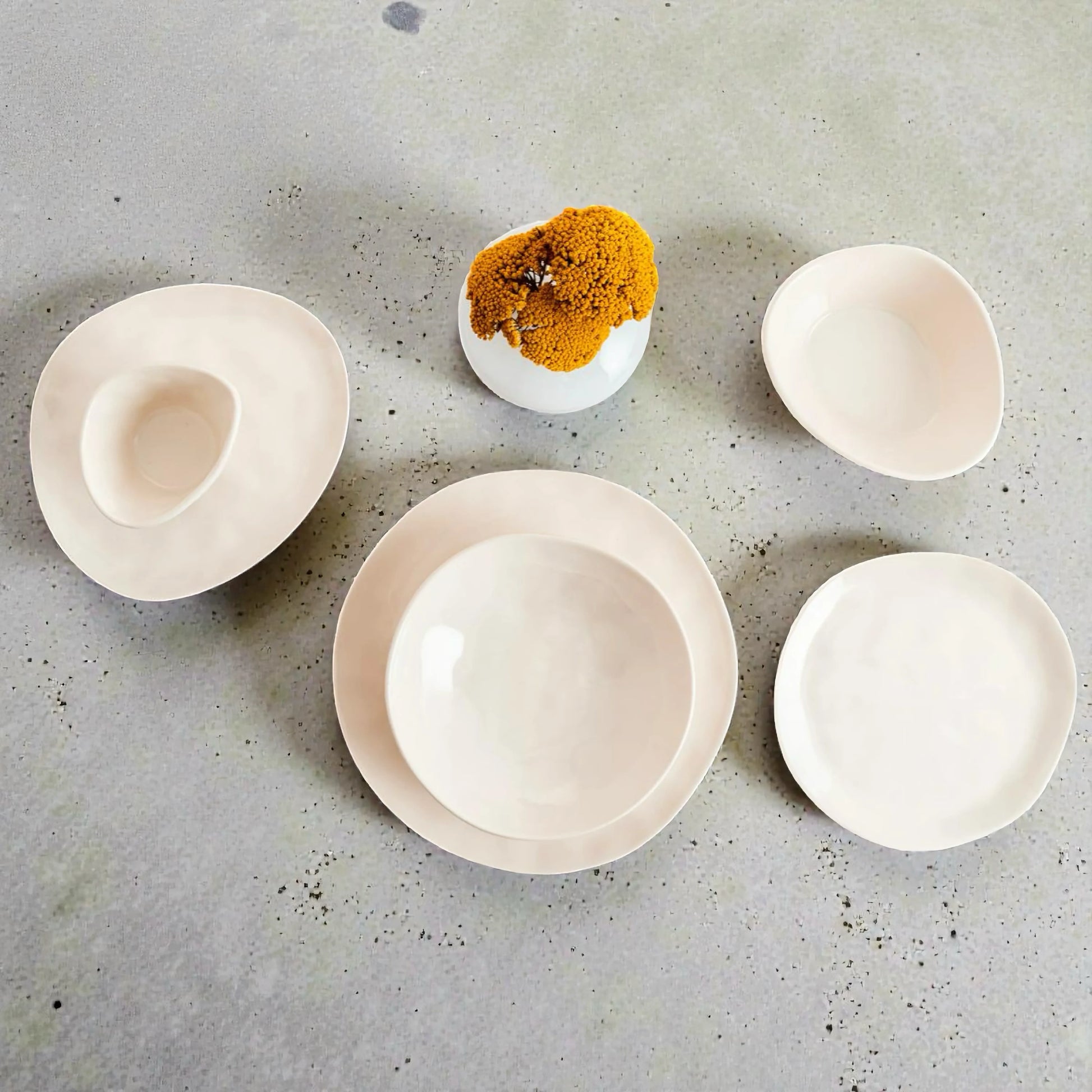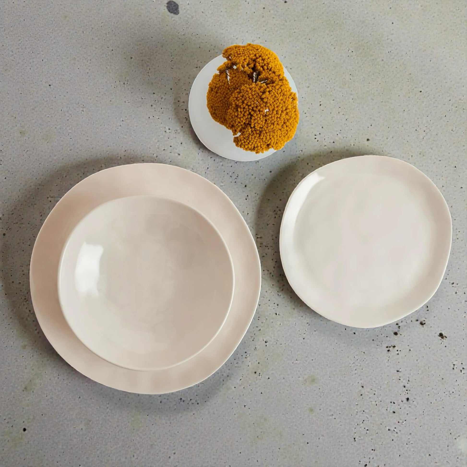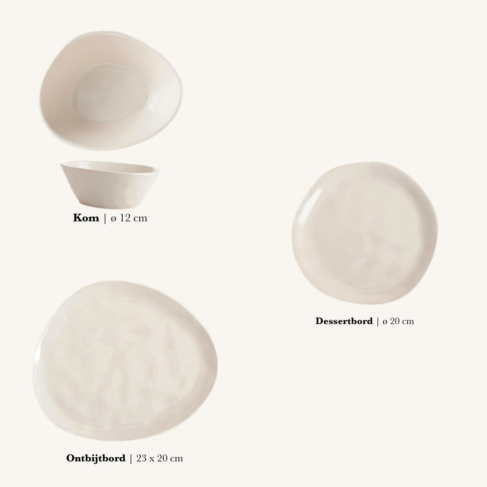 Elk stuk is met de hand gefinisht. De subtiele variaties in vorm en glazuur maken uw set werkelijk uniek — een teken van puur artisanaal handwerk.